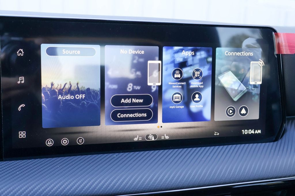 - Radio: AM/FM/SiriusXM Audio System -inc: 12.3" color touchscreen display w/6 speakers, Bluetooth® hands-free phone system, streaming audio via Bluetooth®, NissanConnect Services powered by SiriusXM featuring wireless Apple CarPlay, wireless Android Auto, Siri eyes free and hands-free text messaging assistant, audio and Bluetooth® steering wheel switches and Wi-Fi hotspot