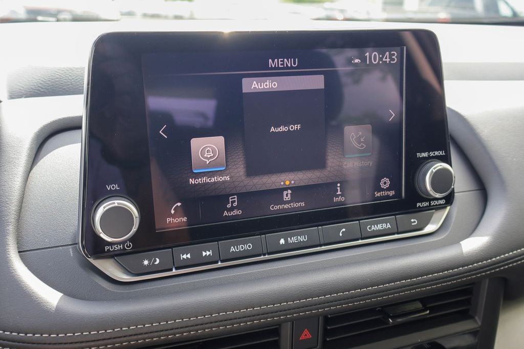 - Radio: AM/FM NissanConnect -inc: 6 speakers plus 2 tweeters, Apple CarPlay, Android Auto, 8" color touch screen display, Bluetooth®, 2 front USB type-C, Wi-Fi hotspot and NissanConnect Services powered by SiriusXM