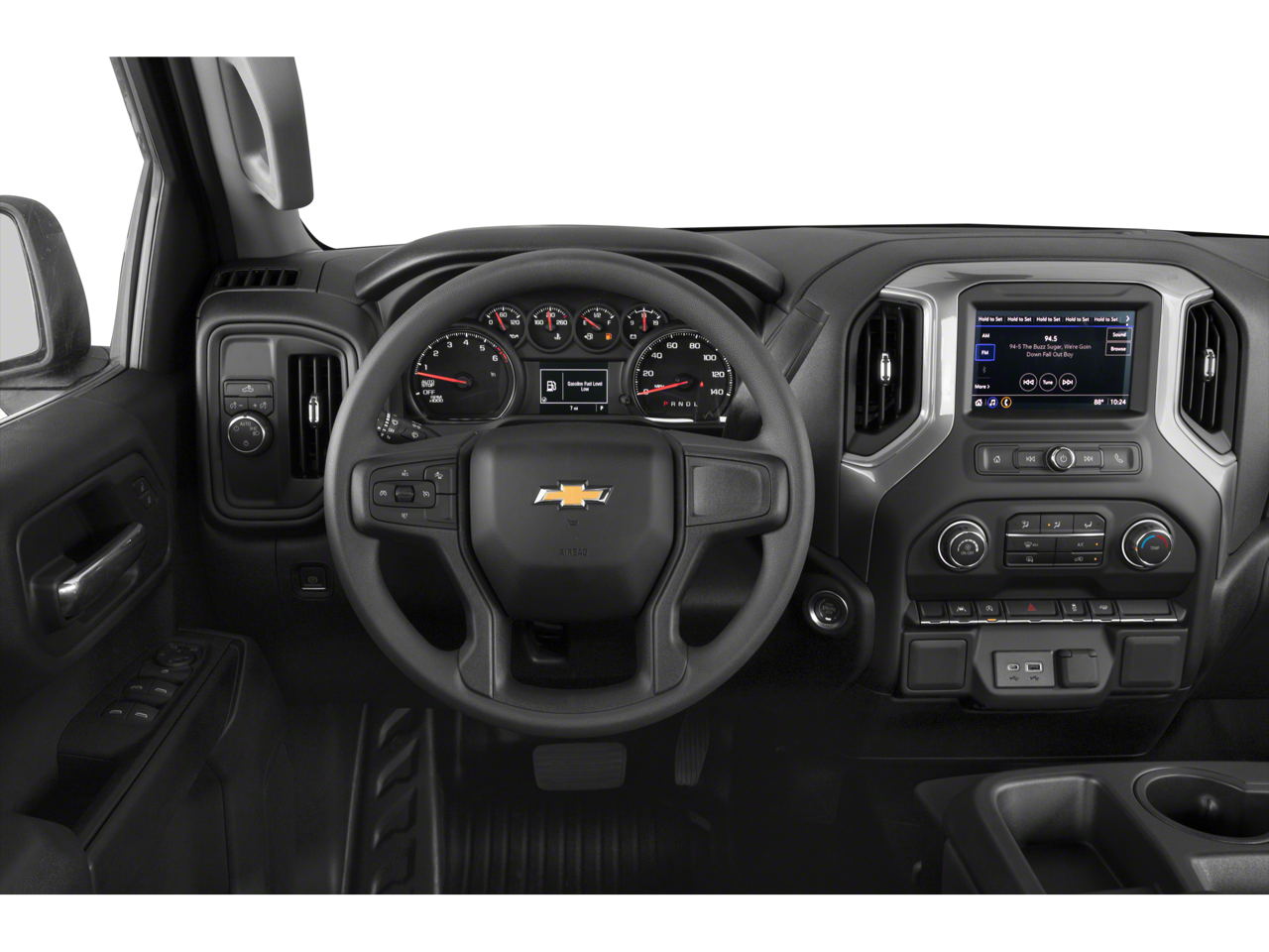 Preferred Equipment Group 1WT (3.5 Monochromatic Display Driver Info Center, Black (Semi-Gloss) Front Bumper, Black (Semi-Gloss) Rear Bumper, Black Manual Outside Mirrors, Bluetooth® For Phone, Electrical Steering Column Lock, HD Rear Vision Camera, Inside Rear-View Mirror w/Tilt, Locking Tailgate, Manual Tailgate Function w/No EZ Lift, Manual Tilt Wheel Steering Column, Power Front Windows w/Driver Express Up/Down, Power Front Windows w/Passenger Express Down, Power Rear Windows w/Express Down, Rear 60/40 Folding Bench Seat (Folds Up), Remote Keyless Entry, Rubberized-Vinyl Floor Covering, Solar Absorbing Tinted Glass, and Standard Tailgate), Standard Suspension Package, Trailering Package (Hitch Guidance), 8-Speed Automatic, Jet Black Vinyl, 120-Volt Bed Mounted Power Outlet, 120-Volt Instrument Panel Power Outlet, 220 Amp Alternator, 3.42 Rear Axle Ratio, 4-Wheel Disc Brakes, 40/20/40 Front Split-Bench Seat, 6 Speakers, 6-Speaker Audio System, ABS brakes, Air Conditioning, AM/FM radio, Apple CarPlay/Android Auto, Auto High-beam Headlights, Automatic Emergency Braking, Brake assist, Chevrolet Connected Access Capable, Color-Keyed Carpeting Floor Covering, Compass, Deep-Tinted Glass, Delay-off headlights, Driver door bin, Dual front impact airbags, Dual front side impact airbags, Dual Rear USB Ports (Charge Only), Electronic Cruise Control, Electronic Stability Control, EZ Lift Power Lock & Release Tailgate, Following Distance Indicator, Forward Collision Alert, Front anti-roll bar, Front Center Armrest w/Storage, Front Chrome Bumper, Front License Plate Kit, Front Pedestrian Braking, Front reading lights, Front Rubberized Vinyl Floor Mats, Front wheel independent suspension, Fully automatic headlights, Heated Power-Adjustable Outside Mirrors, Illuminated entry, Integrated Trailer Brake Controller, IntelliBeam Automatic High Beam On/Off, Lane Keep Assist w/Lane Departure Warning, LED Cargo Area Lighting, Low tire pressure warning, Not Equipped w/Rear USB Ports, Not Equipped w/Steering Column Lock, Occupant sensing airbag, OnStar & Chevrolet Connected Services Capable, Outside temperature display, Overhead airbag, Overhead console, Panic alarm, Passenger door bin, Passenger vanity mirror, Power steering, Power windows, Premium audio system: Chevrolet Infotainment 3, Radio data system, Radio: Chevrolet Infotainment 3 System, Rear Chrome Bumper, Rear reading lights, Rear Rubberized-Vinyl Floor Mats, Rear step bumper, Remote keyless entry, SiriusXM Radio, Speed-sensing steering, Split folding rear seat, Tachometer, Tilt steering wheel, Traction control, Trip computer, Variably intermittent wipers, Vinyl Seat Trim, Voltmeter, Wheels: 17 x 8 Ultra Silver Painted Steel, Wi-Fi Hot Spot Capable, and Wireless Phone Projection.